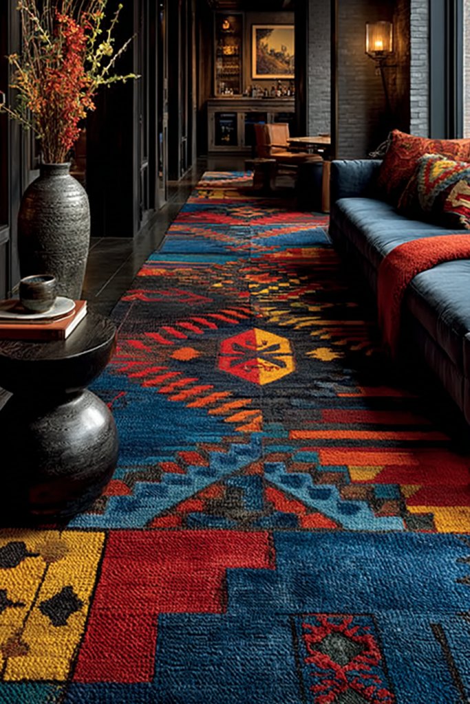 Picture a vibrant Moroccan rug with intricate geometric designs stretching beneath a cozy sofa. Or a bohemian-style rug with swirling patterns and earthy colors that add warmth. Textured patterns, like zigzags or florals, inject energy and movement into the space. The rich colors and bold designs create a sense of depth, making a room feel layered and inviting. It’s like adding a piece of art directly onto your floor.