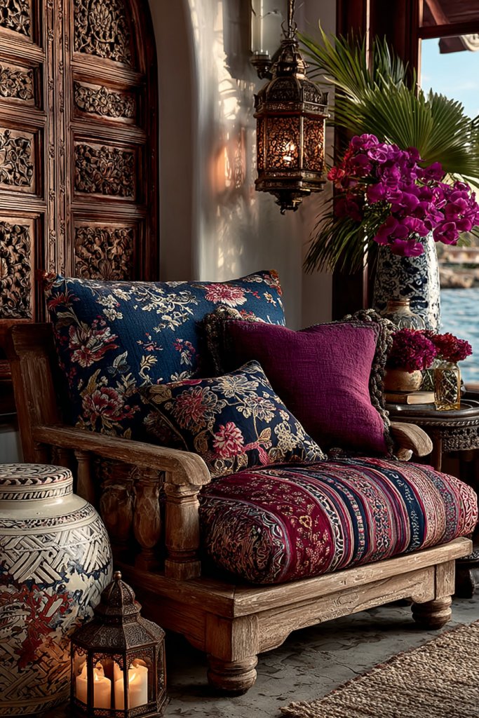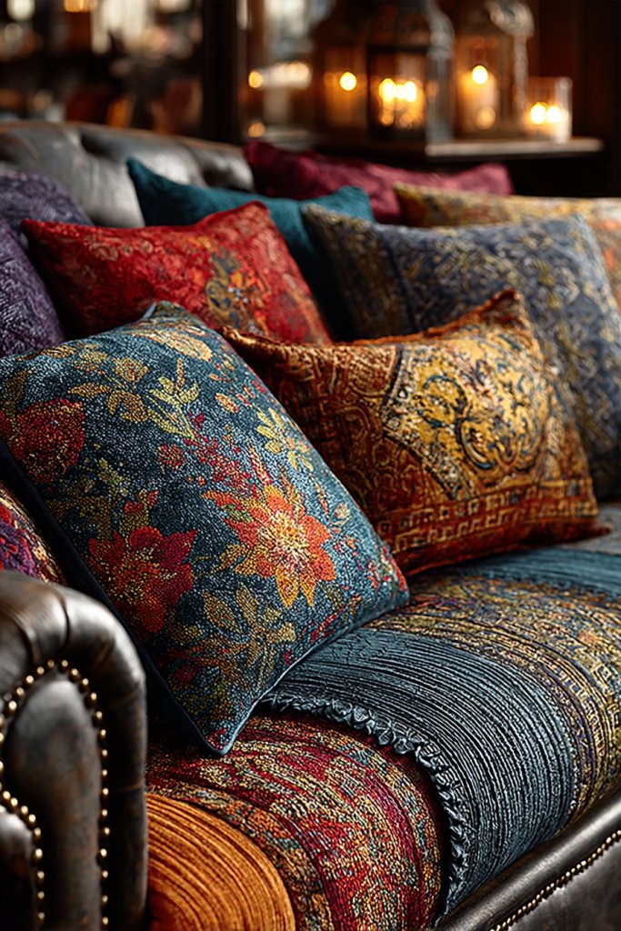 Select a variety of pillows in different shapes—squares, rectangles, or bolsters—and in bold, complementary colors or patterns. Use high-quality covers with hidden zippers for easy cleaning. Layer pillows casually rather than perfectly aligned for a relaxed look. Mix fabrics—silk, linen, velvet—to create tactile richness. Incorporate textiles in other areas like curtains or bedding for a cohesive feel. Refresh the look regularly by swapping out covers or adding new patterns.
