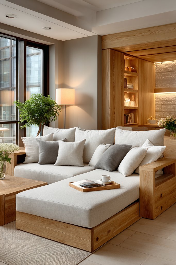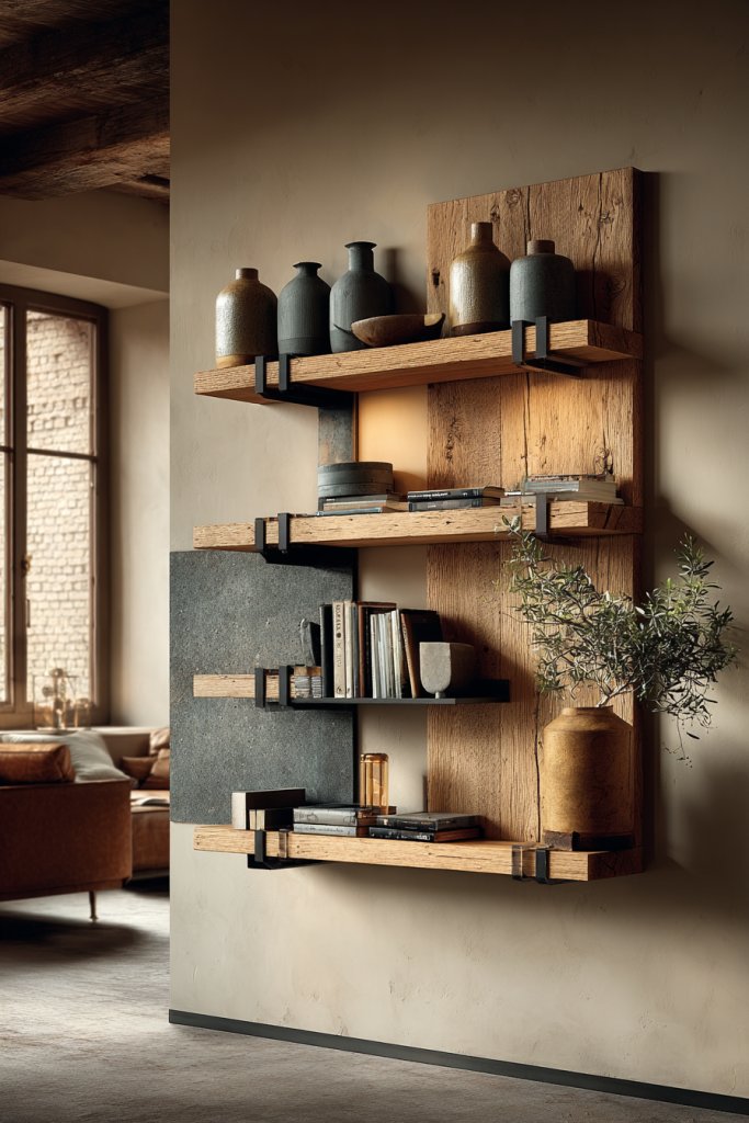 Imagine a set of floating wooden shelves adorned with a mix of vintage books, textured ceramics, and colorful storage boxes. The open design allows you to layer items at different heights for visual interest. Incorporate decorative objects like sculptural pieces or framed mementos—without cluttering the space. The shelves become a gallery of your personality, blending form and function seamlessly.