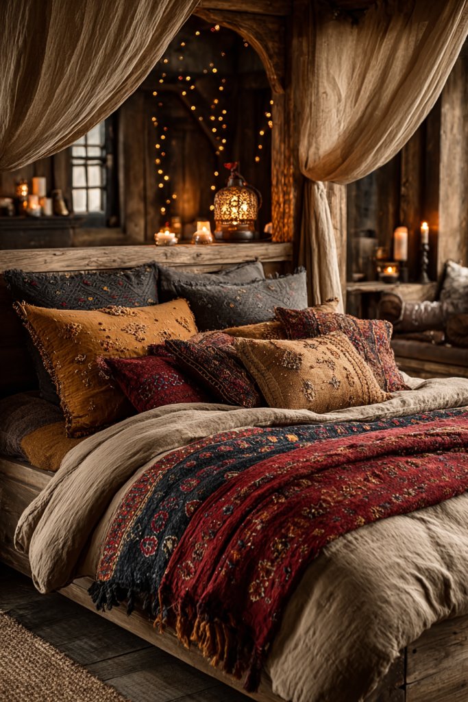 Imagine a bed draped with flowing, patterned canopies and layered with textured throws, cushions, and quilts. Soft, sheer fabrics in vibrant colors or earthy tones add depth and movement. The layers catch light and create a sense of intimacy. Incorporate macramé, fringe, and embroidered details for a handcrafted, boho vibe. The overall look is lush, inviting, and full of personality—a perfect escape.
