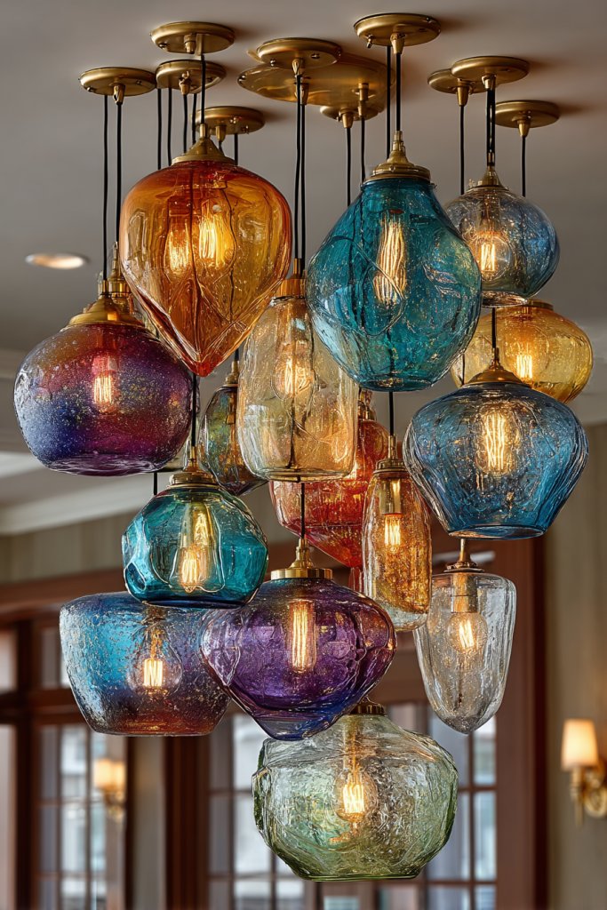 Imagine a cluster of mismatched pendant lights in different shapes, colors, and finishes hanging above a dining table. Or a vintage-inspired chandelier with colorful glass or ornate metalwork in a living room. These fixtures serve as focal points, drawing attention upward and adding visual interest. The eclectic mix creates a playful, curated atmosphere that feels both nostalgic and modern.