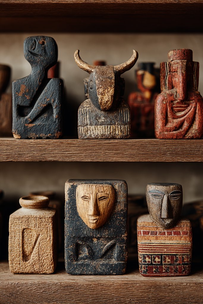 Picture a collection of abstract sculptures in varied materials—metal, wood, ceramic—placed on shelves, tables, or pedestals. Or vintage artifacts like tribal masks, carved figures, or antique trinkets displayed thoughtfully. These items add texture, history, and visual intrigue, creating layers of meaning. The varied shapes and finishes keep the eye moving and the mood lively.