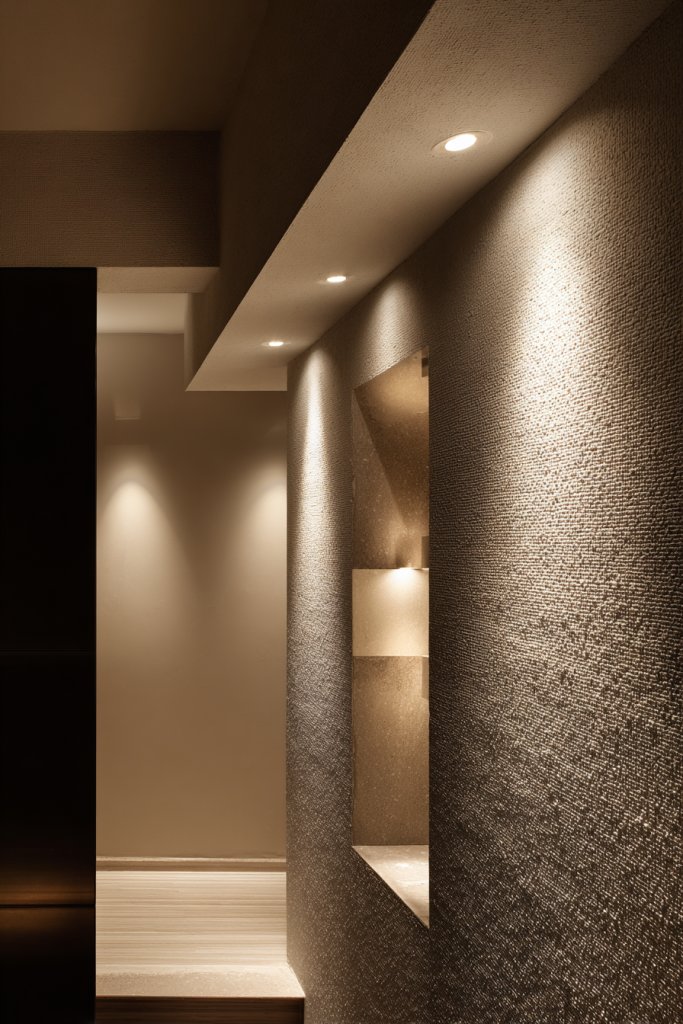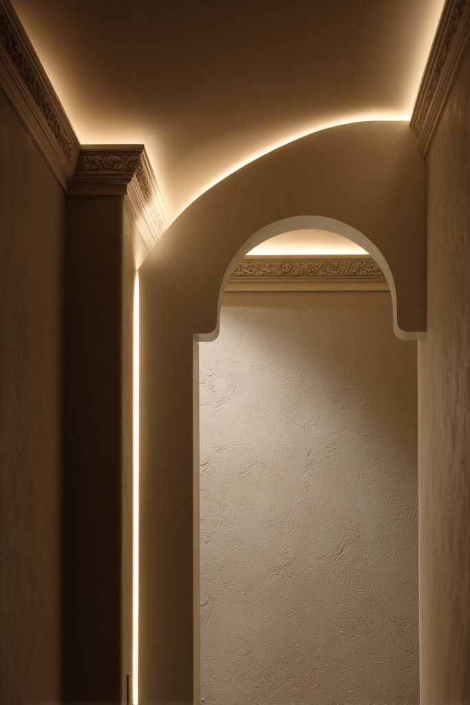 Imagine LED strip lights hidden behind crown molding or under a ledge, casting a soft glow along the ceiling or wall. The light softly emphasizes textures, shapes, and architectural details, creating a layered visual effect. When the lights are dimmed, the space feels cozy and intimate; when bright, it’s lively and welcoming. It’s like your hallway is wrapped in a gentle, ambient hug.