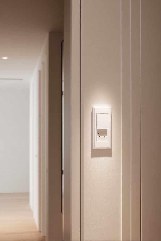 Imagine a sleek fingerprint or keypad lock replacing your traditional door lock, with an app controlling access remotely. Motion sensors trigger lights as you enter, illuminating the space instantly. Wireless charging stations are integrated into a console or wall panel, keeping devices powered without cables. The setup looks modern and unobtrusive, seamlessly blending into your decor while enhancing security and ease of use.