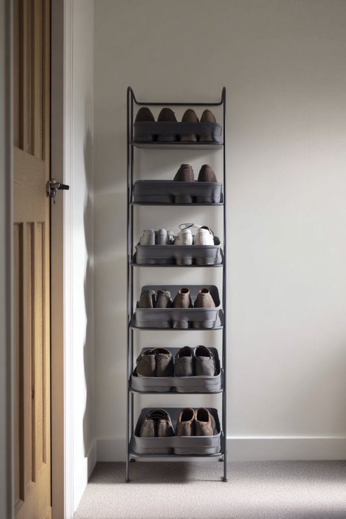 Picture a tall, slim rack with open slots or cubbies, crafted from metal, wood, or a combo. Shoes are neatly stacked or lined up, creating a clean visual line along the wall. The design is minimal—perhaps with a matte finish or a pop of color—complementing any decor. The space feels instantly less chaotic, and your favorite kicks are front and center, ready to go. It’s functional art for your hallway.