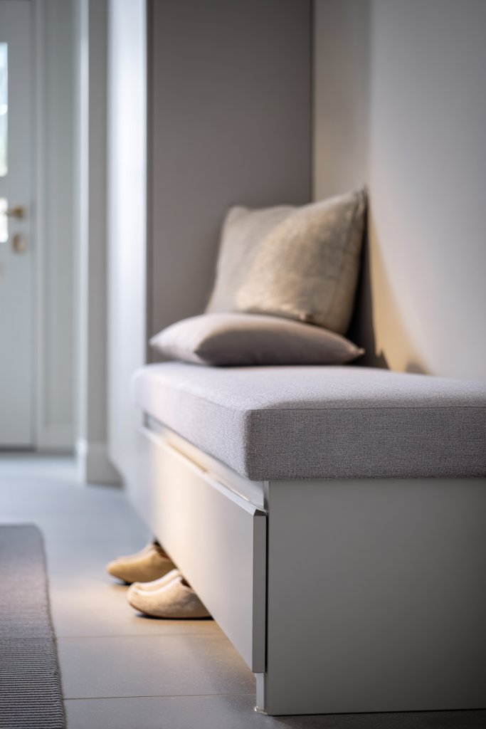 Imagine a sleek upholstered bench in a neutral fabric, with drawers or cubbies underneath. You sit comfortably while putting on your shoes, and the storage keeps clutter out of sight. The bench could feature textured fabric, tufted details, or a wood frame with metal accents—whatever suits your style. Positioned against a textured wall or under a mirror, it anchors the space with both form and function.