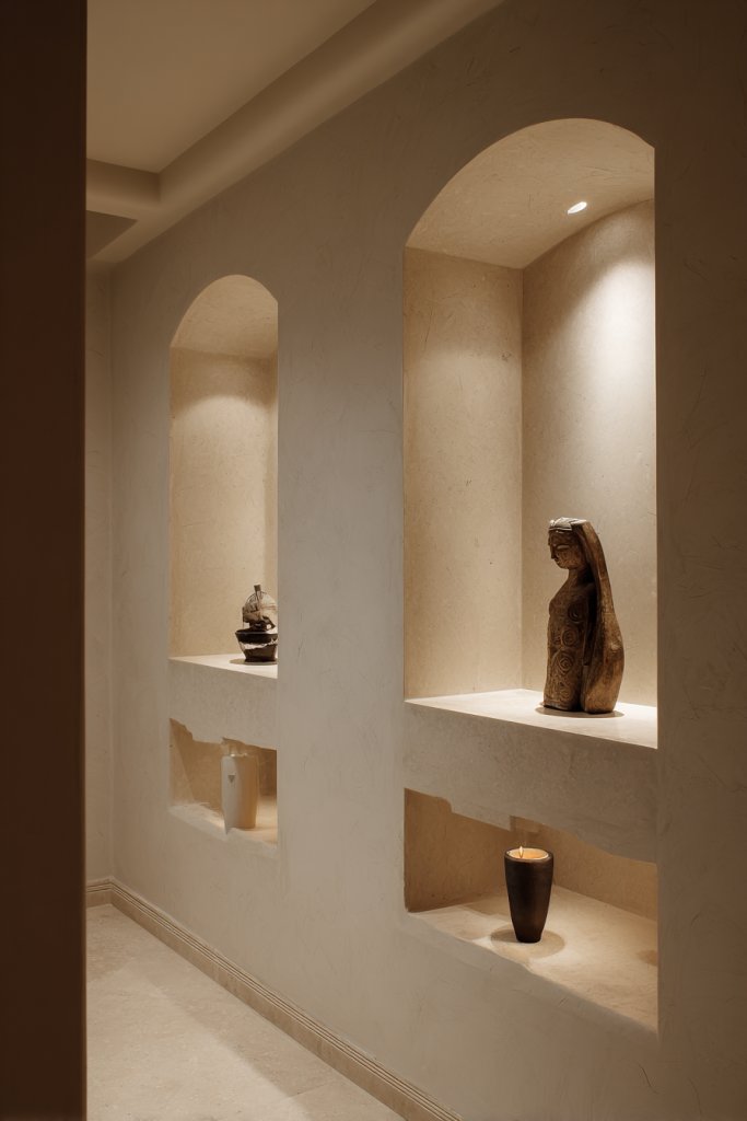 Decorate niches with personalized objects, like travel souvenirs or family heirlooms, for a meaningful touch. Use textured or patterned backgrounds inside the niches for added depth. Incorporate lighting to make the objects stand out at night. Experiment with different arrangements—layering height and shape—to create visual interest. This approach turns your walls into storytelling canvases.