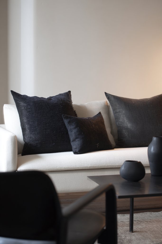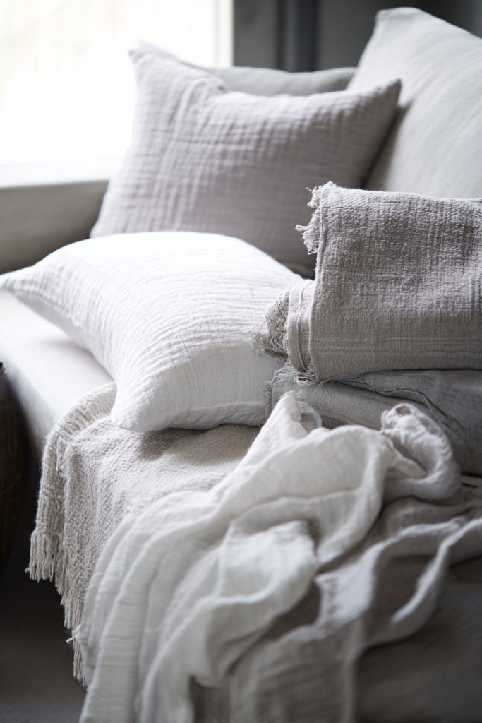Picture a plush linen cushion in a muted taupe resting on a sleek, low sofa. A hemp or cotton throw in a neutral tone drapes casually over the armrest. The textures invite touch, and the muted hues blend seamlessly with the surrounding decor. The overall effect is a calm, cozy environment that’s both functional and beautiful.