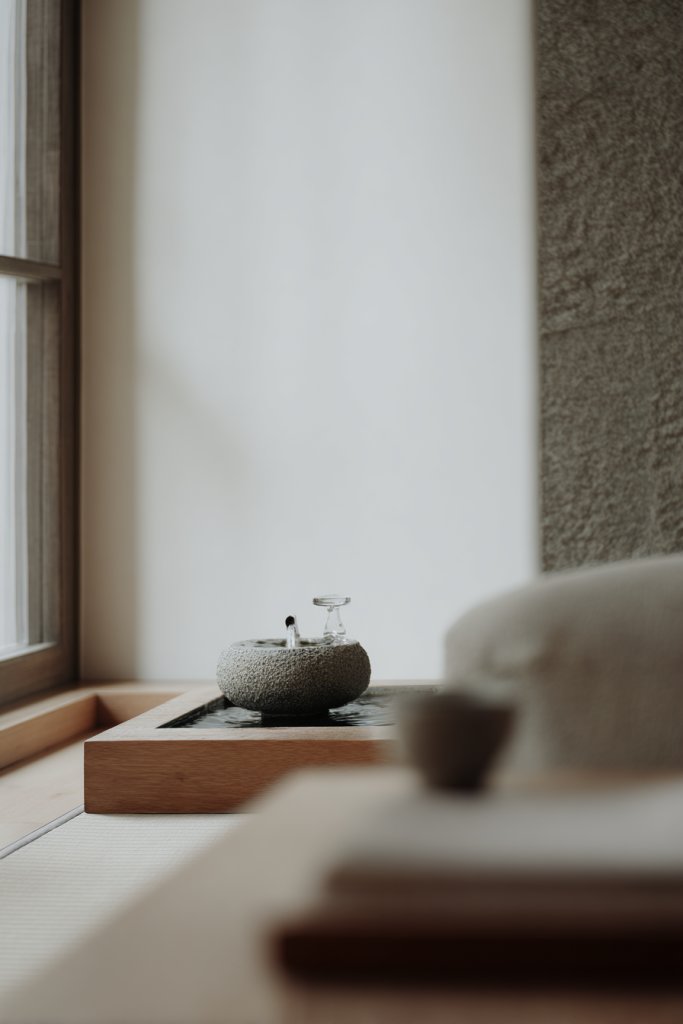 Imagine a small, sleek basin with a quiet, continuous flow of water, placed on a natural wood or stone pedestal. The sound of trickling water creates a soothing ambiance, complemented by minimalist decor and natural textures. The feature adds a focal point that encourages mindfulness and a sense of harmony. Soft lighting accentuates the movement of water, adding to the calming effect.