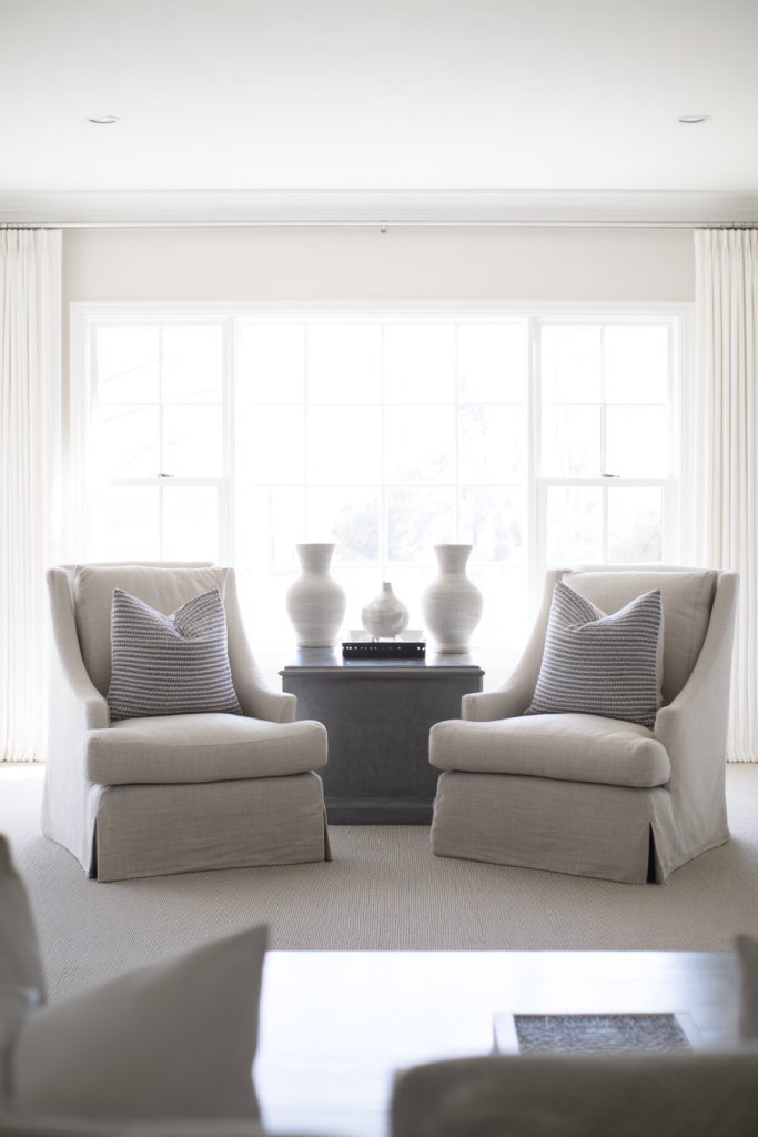 Picture a pair of matching armchairs flanking a low coffee table, with identical cushions and side tables. The artwork or decor on either side mirrors each other, creating a balanced focal point. Neutral tones and aligned furniture lines reinforce the sense of symmetry. The overall effect is calming and well-curated.
