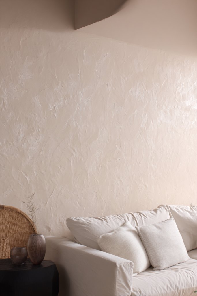 Imagine a wall coated in soft, matte stucco with a slightly uneven surface, painted in a gentle neutral shade. The texture catches light differently throughout the day, adding dimension. Complement this with simple furniture and textiles to let the wall’s character shine. The overall effect is warm, inviting, and refined.