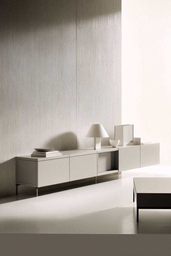 Imagine a sofa with sleek, rectangular arms and a low profile, paired with a slim, rectangular coffee table. The decor features geometric vases and smooth, rounded bowls—all in neutral shades. The overall aesthetic is effortlessly modern, with each piece contributing to a harmonious flow. Light plays softly across the surfaces, emphasizing their simplicity.