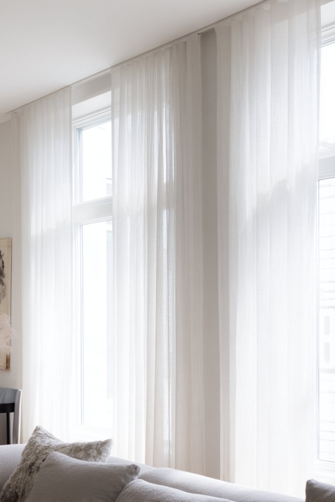 Visualize flowing, semi-transparent curtains in soft white or cream, billowing gently with a breeze. The light filters through, casting a warm, diffused glow across neutral walls and minimalist furniture. The fabric’s subtle texture adds a layer of softness, complementing the natural wood accents and textured rugs. The overall effect is a serene, luminous space that feels alive.