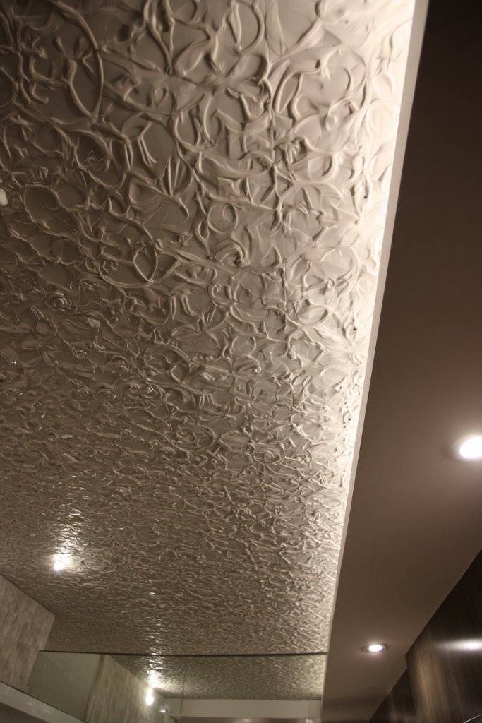 Picture a ceiling with irregular, artistic textures—swirls, stipples, or embossed patterns—that catch the light and create shadows. The textured surface adds depth, making the ceiling appear more dynamic and layered. The soft shadows emphasize the tactile nature, inviting the eye to explore the details. Pair it with simple lighting to highlight the textures without overwhelming the space.