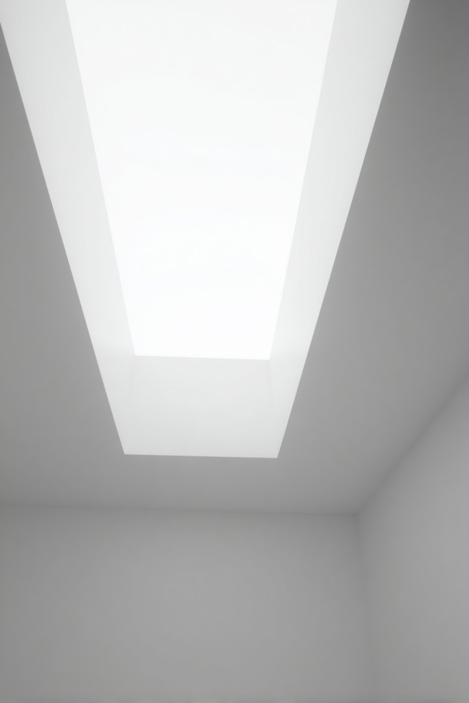Visualize a sleek, seamless ceiling with a central or perimeter cutout that mimics a skylight. LED lighting behind or within the opening simulates daylight, casting a soft glow that mimics natural sunlight. The overall effect is a bright, open atmosphere that visually expands the room. The clean edges and minimal framing emphasize the frameless look.