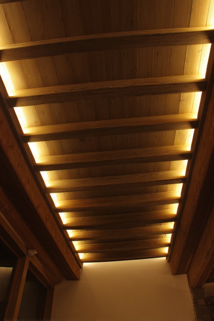 Visualize faux wooden beams running across your ceiling, with LED strips concealed behind them. The lighting softly illuminates the beams, casting warm shadows and emphasizing their texture. The beams can be painted or stained to match your decor, from light Scandinavian to dark farmhouse. The overall effect is a warm, inviting space with a touch of architectural drama.
