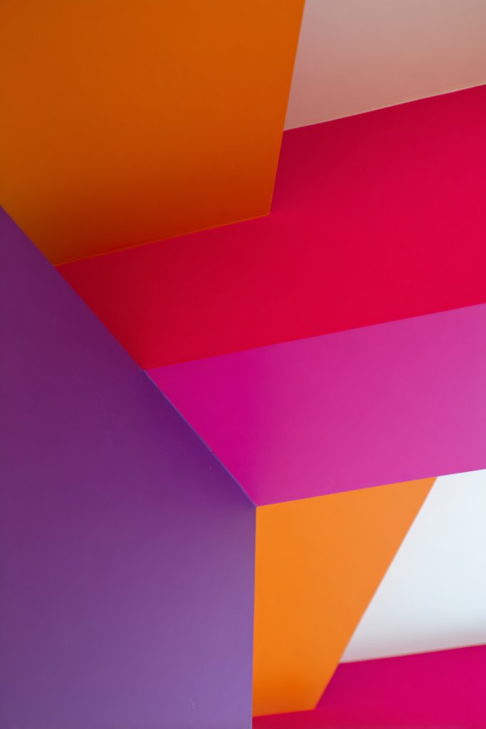 Imagine large blocks of contrasting colors—like teal, orange, and white—organized in geometric patterns across the ceiling. The vivid hues draw attention upward and create a lively atmosphere. When paired with neutral walls, they act as a focal point. The clean lines and sharp color divisions give your room a modern, energetic vibe.