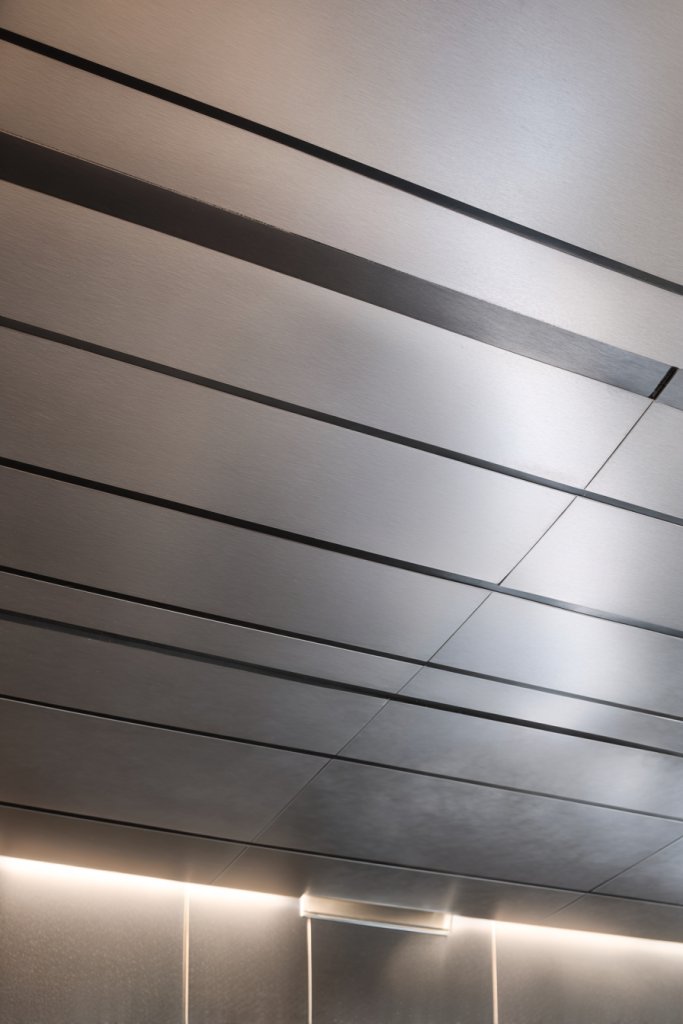 Add colored lighting or backlighting to enhance the metallic effect. Incorporate contrasting textures on adjacent walls to emphasize the sleekness overhead. Personalize with custom patterns or engraved lines for a bespoke look. Mixing materials like glass or acrylic with metal can further elevate the aesthetic.