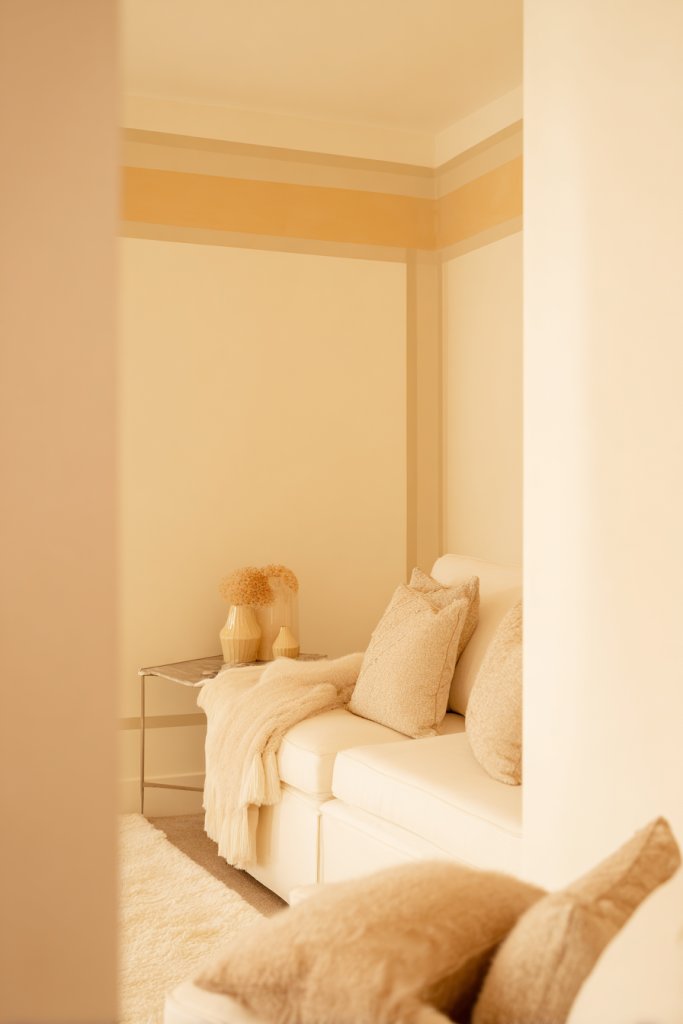 Picture a room bathed in gentle shades of beige and cream, with plush throw pillows and textured blankets adding depth. Think of a soft cream wall, complemented by a cozy beige sofa draped with a chunky knit throw. Soft, natural light filters through sheer curtains, enhancing the warm palette. The overall vibe is soothing, with subtle contrasts that keep the space inviting and not bland.