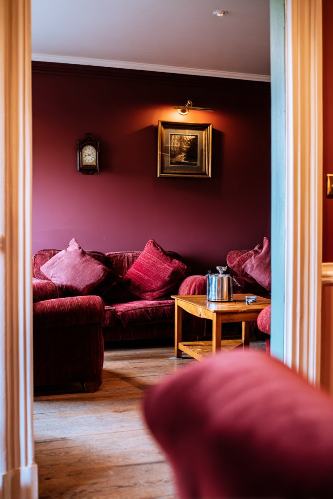 Imagine a plush burgundy velvet sofa complemented by warm oak furniture and accents. Think of walls painted in a deep, rich hue, with natural oak flooring grounding the space. Layered textiles in deep reds, warm browns, and textured fabrics add richness. The room is illuminated by soft, warm lighting, with decorative details like brass fixtures or vintage accessories enhancing the classic vibe.