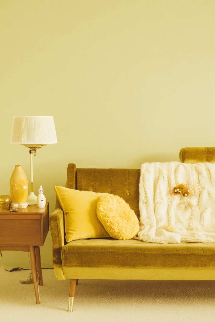 Picture a mint green sofa with pale yellow cushions, set against vintage-inspired wallpaper or painted walls. Think of a room filled with light textiles, ruffled curtains, and retro accessories. Layered rugs and textiles in similar shades add depth, while natural light amplifies the cheerful atmosphere. The space feels lively, nostalgic, and full of personality.