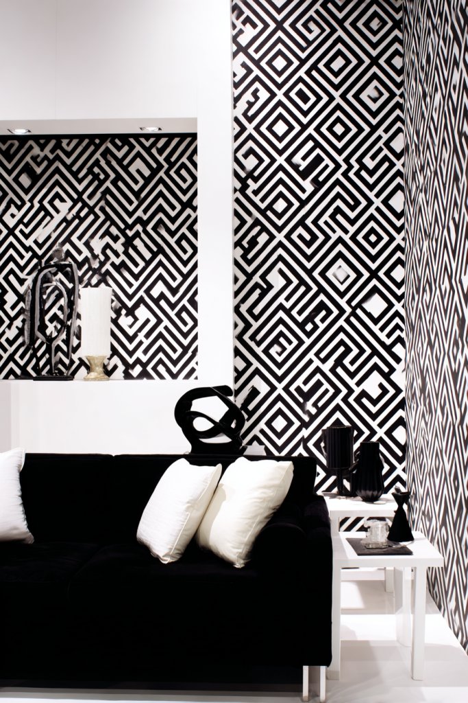 Imagine a black and white patterned rug anchoring a sleek white sofa with black accent cushions. Walls feature bold geometric wallpaper or black trim, with contrasting artwork or decor. Think of a space illuminated by minimalist lighting fixtures that highlight the patterns and textures. The room feels dynamic and energetic, with a striking visual rhythm that commands attention.