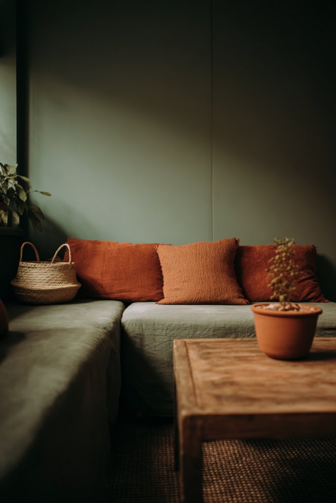 Imagine a sage green wall paired with terracotta cushions and textured textiles. Think of rattan or wicker furniture, layered with cozy throws and patterned rugs in similar earthy tones. Decorative ceramics, woven baskets, and leafy plants complement the palette, creating a space that’s rich in texture and warmth. Soft lighting enhances the relaxed, inviting atmosphere, making it feel like a personal retreat.