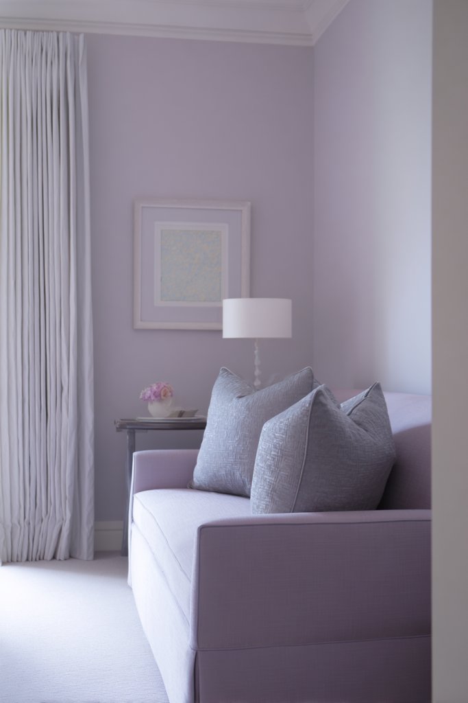 Picture a lavender-colored accent wall or soft lavender cushions on a light gray sofa. Think of a room filled with airy curtains, plush textiles, and delicate decor in muted tones. The overall look is light, airy, and refined, with a touch of femininity. Soft lighting highlights the subtle color variations, creating an environment that invites calm and quiet reflection.