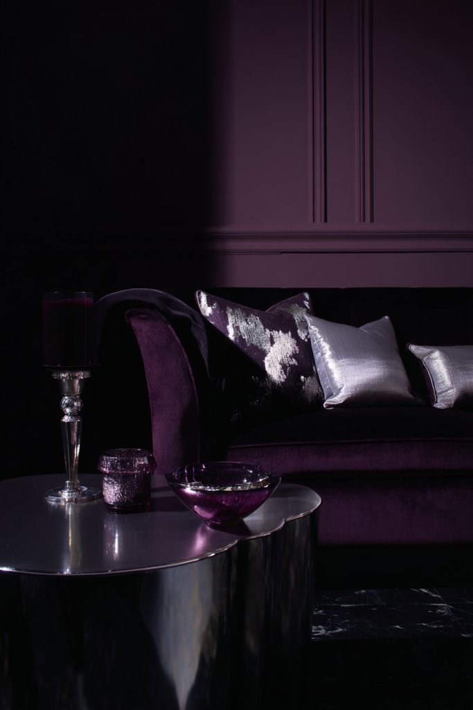 Imagine plum velvet armchairs paired with silver accents—think metallic side tables or decorative decor. Walls in deep plum or with subtle metallic wallpaper set a dramatic backdrop. Soft lighting, such as candles or silver fixtures, reflects off surfaces, creating a luminous glow. The space feels intimate, mysterious, and luxurious, perfect for a cozy night in or stylish entertaining.