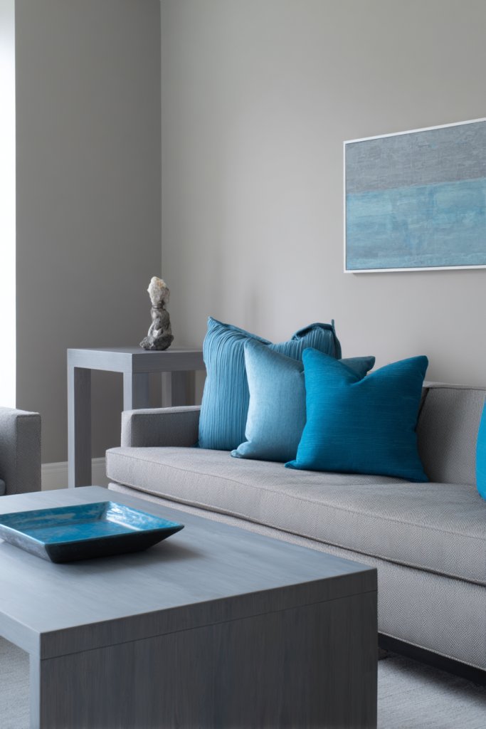 This palette creates a space that feels both modern and calming—perfect for unwinding or hosting friends. The versatility of blues and grays makes it easy to update with accessories over time. Once you see how peaceful your living room looks, you’ll be inspired to extend this calm to other areas of your home, making it a true retreat from chaos.