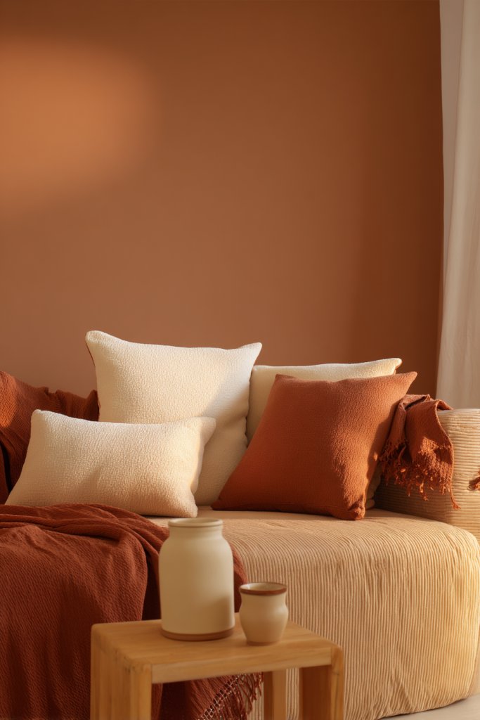 Picture cinnamon-colored walls or accents paired with cream textiles and textured rugs. Think of a plush sofa in warm tones, layered with cozy throws and cushions. Wooden furniture and natural fibers enhance the earthy vibe, while soft lighting amplifies the warmth. The environment feels intimate, comfortable, and full of rustic charm.