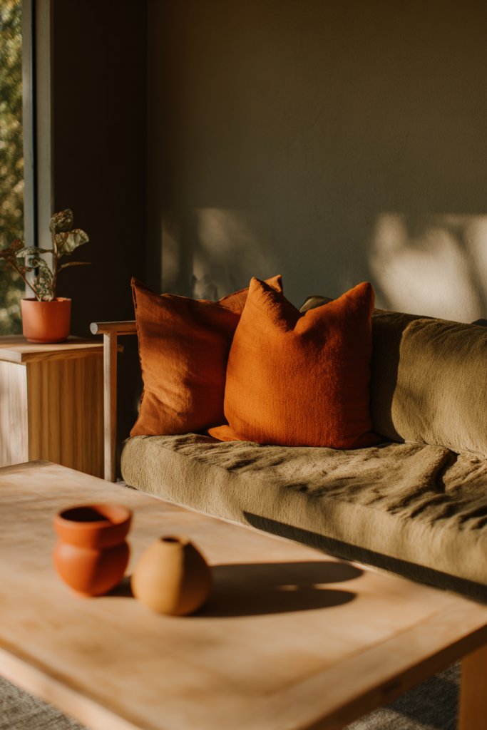 Start with olive green walls or furniture, then layer with burnt orange cushions, throws, and rugs. Use natural, textured fabrics and incorporate wooden or woven furniture to reinforce the outdoor feel. Decorate with ceramics, baskets, or vintage accessories—keeping it simple and organic. Use warm, ambient lighting—like lanterns or filament bulbs—to enhance the earthy atmosphere. Keep decor minimal but impactful.
