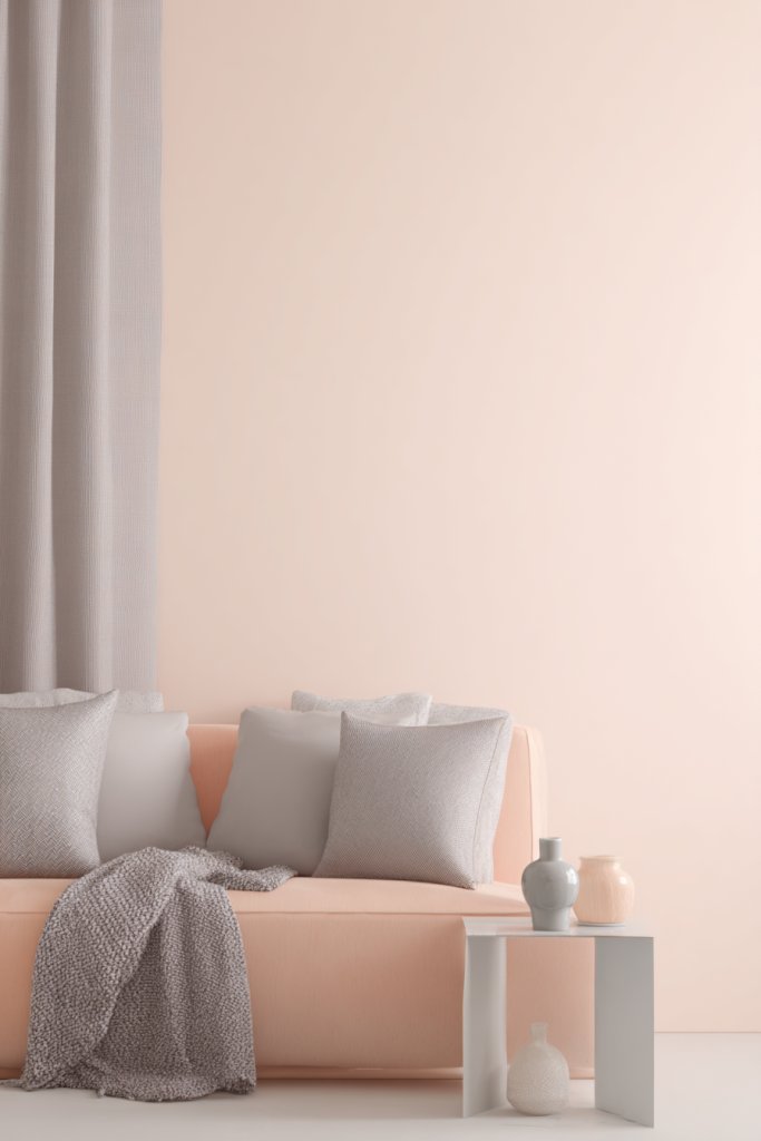Imagine a peach-colored accent wall paired with gray upholstered furniture and textured textiles. Think of a space filled with natural light, with layered curtains and plush cushions in muted tones. Decor includes sleek, minimalist accessories and delicate art pieces that reinforce the refined vibe. The overall effect is soft, calming, and sophisticated.