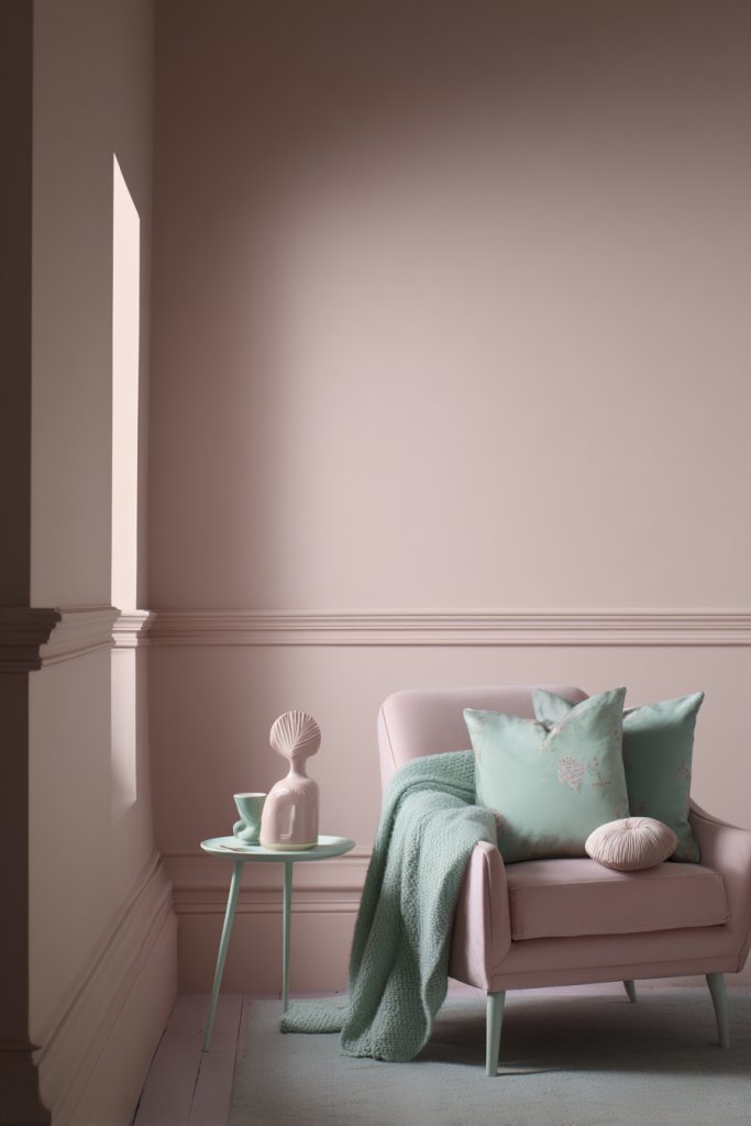 Imagine a blush pink accent wall paired with a mint green sofa, accented by soft white cushions. Picture a space filled with light, airy textiles, and subtle metallic or wood accents. The room feels fresh and delicate, yet curated with intentionality. Light filters through sheer curtains, highlighting the muted tones and soft textures, creating a tranquil, elegant environment.