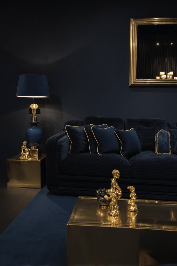 Picture a navy velvet sofa with gold metallic legs, accented by gold-trimmed cushions. Think of a room with navy walls or an accent wall, illuminated by warm, golden lighting. The decor includes a gold-framed mirror, sleek side tables, and textured rugs that add richness and depth. The overall look is dramatic yet refined, perfect for making a statement.