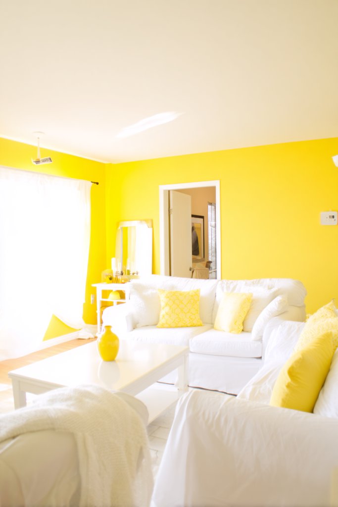 Imagine a sunny yellow accent wall paired with white furniture and light wood accents. Picture a space filled with natural light, complemented by white sheer curtains that diffuse sunlight softly. The room feels lively yet clean, with pops of yellow in cushions, artwork, or decorative accessories. The overall vibe is fresh, vibrant, and welcoming, perfect for gatherings or quiet mornings.