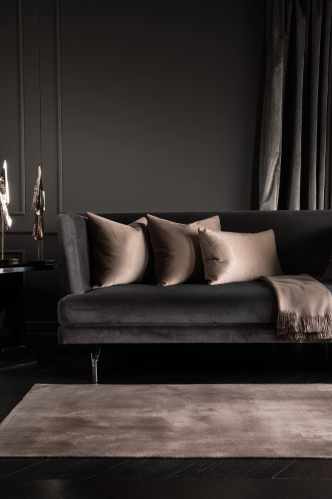 Visualize a charcoal-colored sectional paired with taupe cushions and a textured rug in similar tones. Think of matte black or dark gray walls contrasted with light taupe furniture, creating a balanced, layered look. Subtle metallic or wood accents add warmth, while soft lighting enhances the sophisticated mood. The space feels refined, with a quiet elegance that invites relaxation.