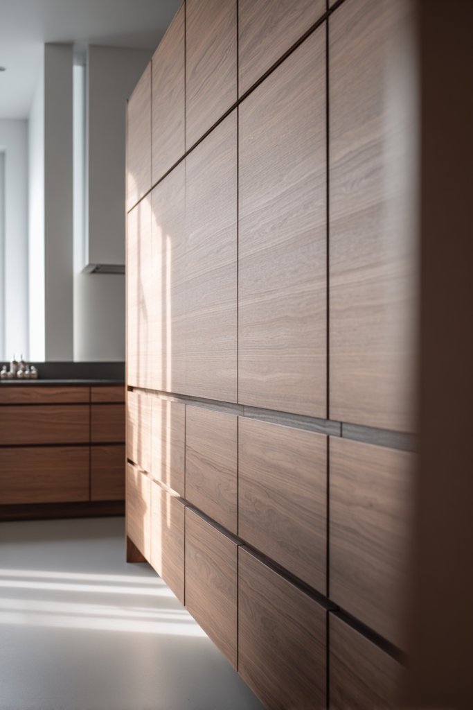 Imagine smooth, handleless cabinets with a rich walnut or teak finish, reflecting warm sunlight and adding natural elegance. The flat fronts create a seamless look, while the subtle grain adds texture. The clean lines draw your eye across the room, making even small kitchens appear larger. It’s the perfect canvas for colorful accents or minimalist decor.