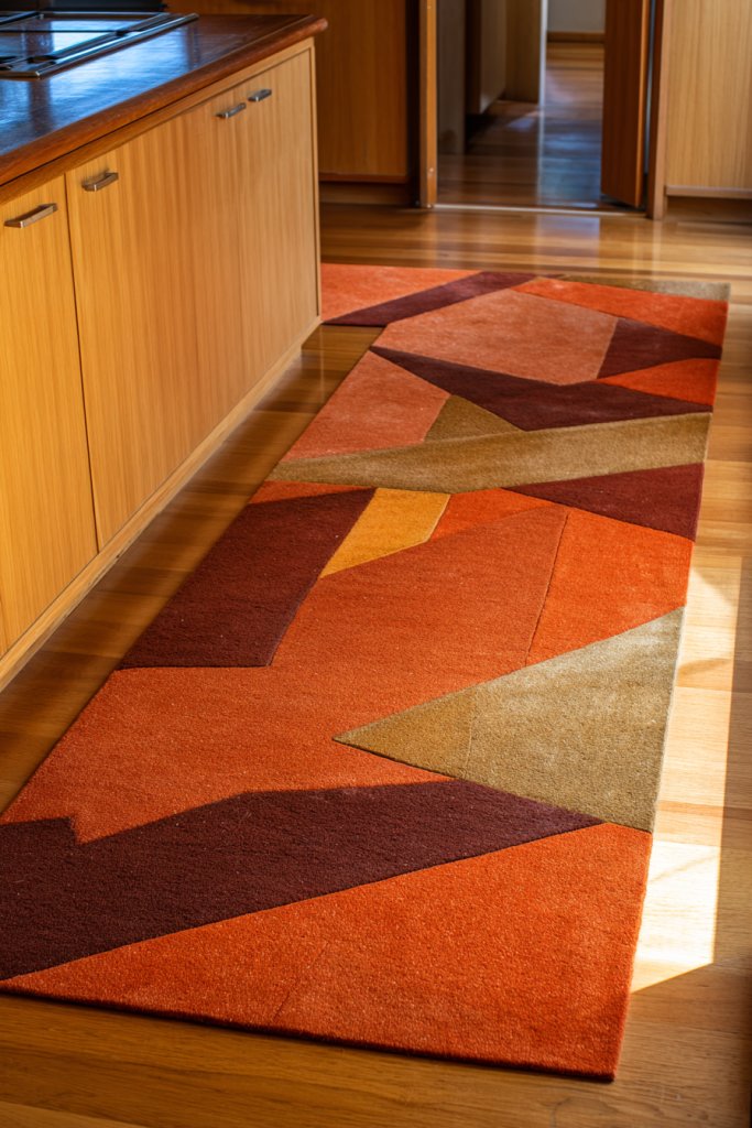 Picture a soft, plush rug with bold triangles or chevrons in mustard, deep orange, or earthy browns. It anchors a seating area or runs along the kitchen’s main walkway, creating visual flow. The pattern adds a layer of interest and draws attention to your design choices. The warm hues complement wood finishes and neutral walls beautifully.