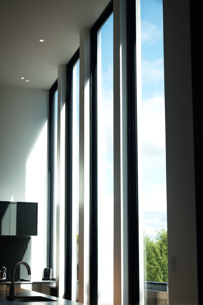 Picture tall, narrow windows stretching from countertop to ceiling, with thin metal or painted frames. They cast soft, even light across your workspace, highlighting textures and colors. The view beyond becomes part of your decor, connecting indoors and outdoors. The minimalist design emphasizes clean lines and unobstructed sightlines, enhancing the sense of space.