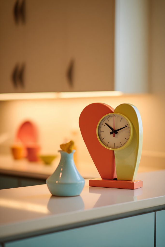 Visualize a retro clock with bold geometric shapes and bright colors, hung above a countertop. Nearby, a ceramic vase with a textured glaze and mid-century motifs holds a few fresh or faux blooms—no green thumbs required. These accents add visual interest and tie the room’s design together, creating a curated, vintage-inspired aesthetic.