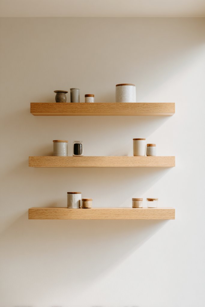 Picture floating shelves in matte black or natural wood, arranged in asymmetrical or symmetrical patterns. They hold a curated selection of colorful bowls, sleek storage jars, or decorative containers—nothing too cluttered. The open design allows light to flow freely, highlighting textures and colors. The minimalist brackets or hidden supports keep the focus on what’s displayed.