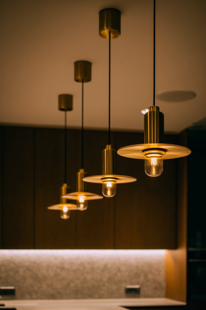 Imagine a cluster of matte black or brushed brass pendants hanging over an island or breakfast bar. The minimalist shapes—think globe, cone, or cylinder—contrast beautifully against flat-front cabinets and smooth countertops. The warm glow they cast enhances natural textures and creates inviting focal points. The metallic sheen plays with light, adding depth and sophistication.