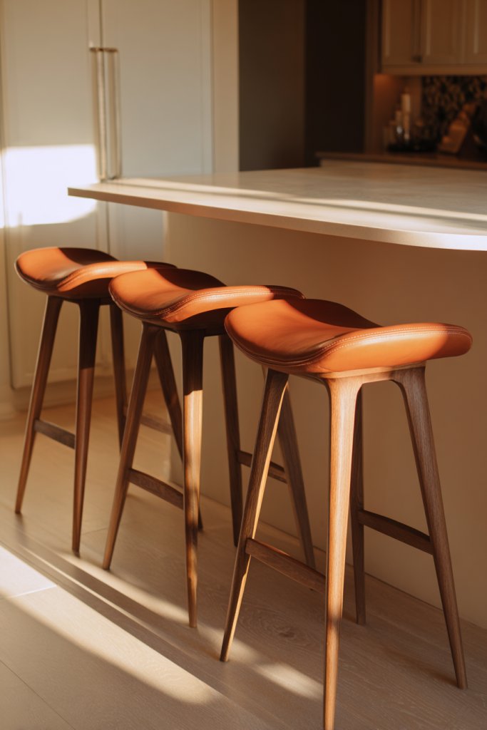 Imagine sleek stools with tapered wooden legs, perhaps in walnut or teak, topped with plush leather or cushioned fabric seats. They line up perfectly along your island or breakfast bar, inviting friends or family to gather. The natural wood adds warmth, while the cushioned seats offer comfort after a long day. The overall effect is both stylish and functional.