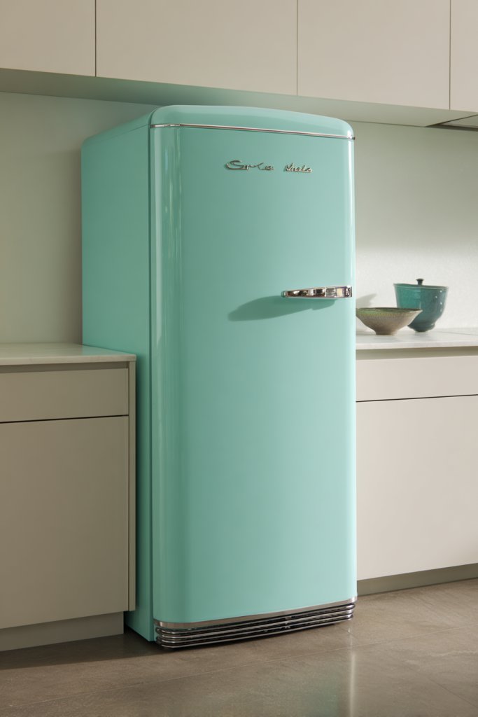 Picture a pastel pink or mint green refrigerator with rounded edges and chrome accents, standing out against sleek cabinetry. Modern tech ensures it runs efficiently, while its retro design sparks conversation. Nearby, matching toasters or mixers in similar styles create a cohesive, playful vibe. The mix of old-school charm and new-age performance makes the kitchen feel both cozy and functional.