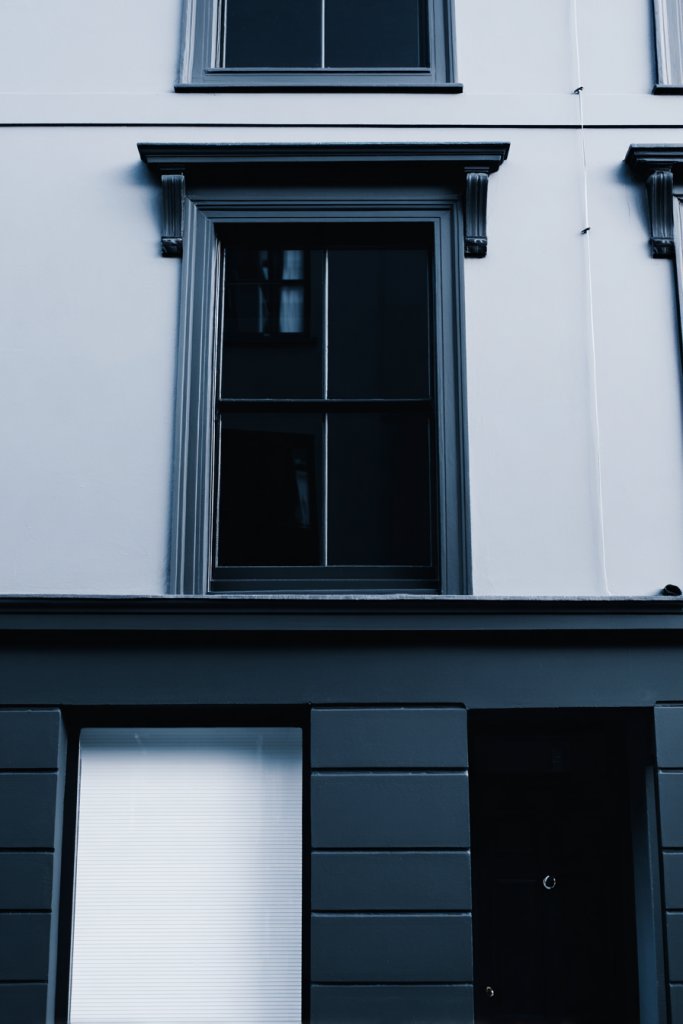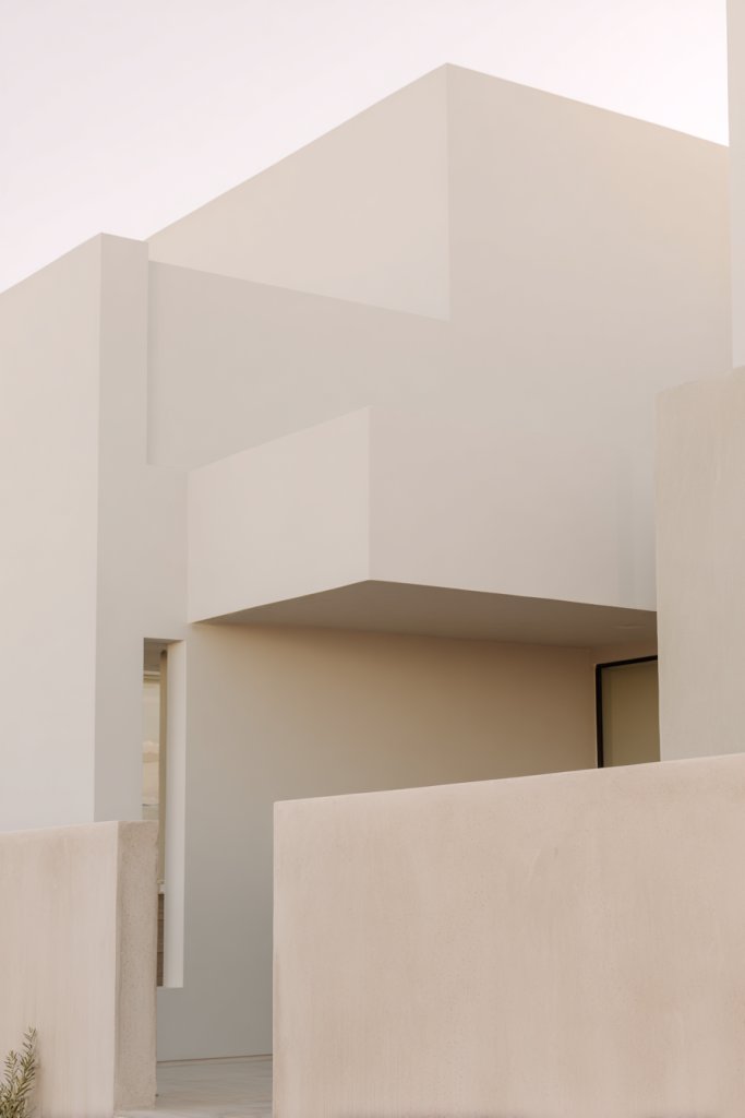 Picture a smooth, stucco wall painted in a soft taupe or off-white, with crisp geometric shapes framing the entrance. The clean lines extend to narrow, elongated windows that reflect the sky, adding a touch of elegance. The subtle contrast between matte and semi-gloss finishes highlights architectural simplicity. The overall look is calm, cohesive, and modern—like a breath of fresh air.