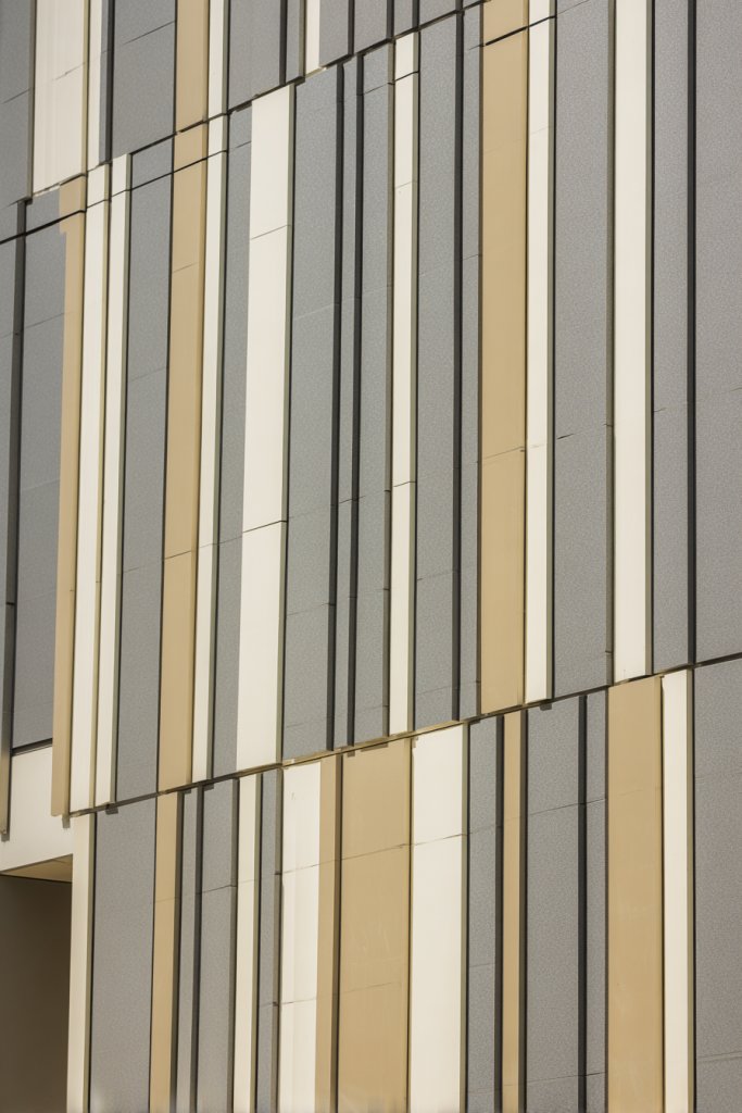 Imagine alternating panels of textured wood, metal, or fiber cement arranged vertically or horizontally across the facade. These panels create a layered, rhythmic pattern that guides the eye across the structure. The mix of materials and orientations adds depth and dimension, making the surface appear more complex and engaging. During different lighting conditions, shadows enhance the textured details, adding to the dynamic feel.