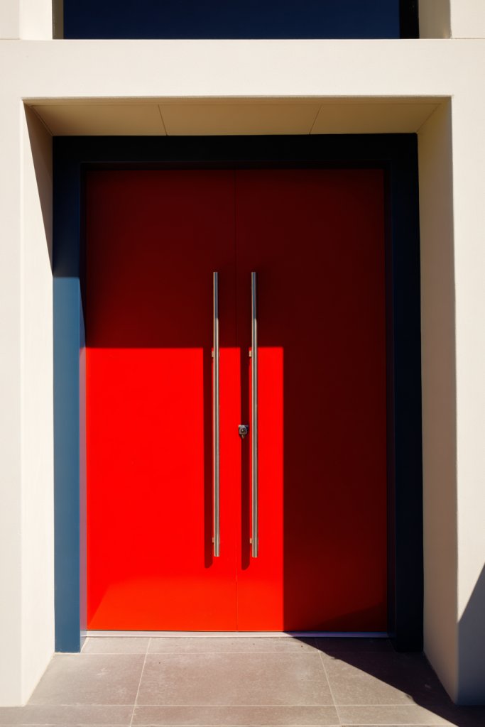 Envision a large, solid door painted in a striking hue like deep blue, fiery red, or emerald green. The surface is smooth, complemented by modern, minimalist handles in matte black or brushed metal. Textured accents, such as wood grain or geometric patterns, add depth. Spotlights or wall-mounted sconces highlight the door’s bold presence, making it a true focal point.