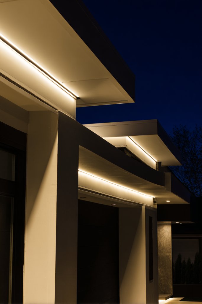 Picture small, hidden lights installed along the edges of overhangs, cornices, or wall recesses. During the evening, these lights cast gentle pools of illumination, emphasizing textures, shapes, and depth. The warm glow creates inviting shadows and highlights, making architectural features pop. The overall effect is sophisticated, understated, and inviting.