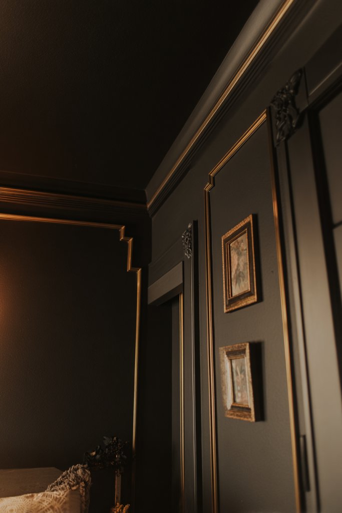 Start with high-quality matte charcoal paint, ensuring even application for a velvety finish. Next, select gold fixtures—think drawer handles, picture frames, or decorative trim—and install them where they catch natural or artificial light. Incorporate warm LED lighting with dimmable options to control the mood. Use painter’s tape to create clean lines or geometric patterns if you want a more artistic flair. Finish with plush textiles and layered bedding to enhance comfort and warmth.